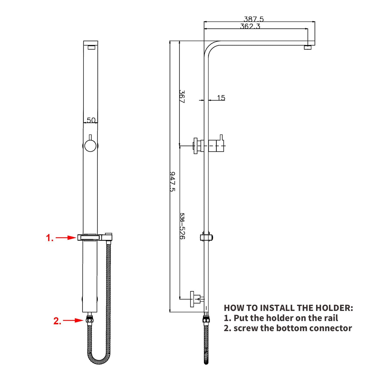 Aquaperla Square Wide Shower Rail with Diverter Top Water Inlet